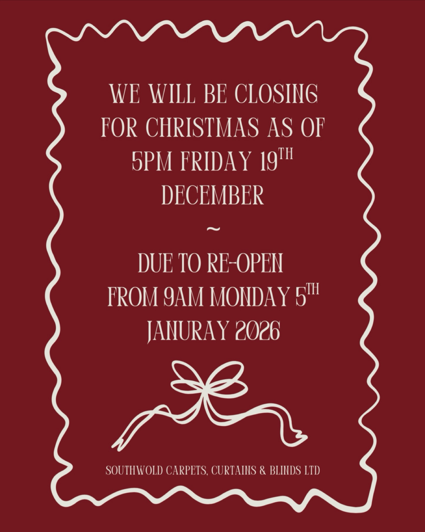 We will be closing for Christmas as of 5pm on Friday 19th December ~ due to re-open from 9am on Monday 5th January 2026.